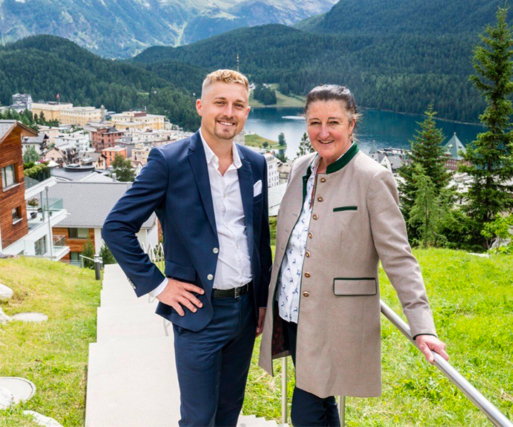 Kundenberaterin Erna Giovanoli mit ihrem Churer Kollegen Nico Sciamanna beim Fototermin in St. Moritz.