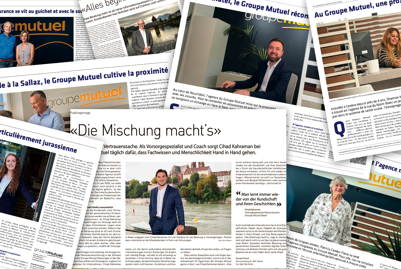 Die Zitate stammen aus drei der zahlreichen Zeitungsartikel, die Mitte September im Rahmen der Imagekampagne zum Thema «Kundennähe» erschienen sind. Gemeinsam mit den erstmals ausgestrahlten Spots in verschiedenen Lokalradios vermitteln sie einen vielfältigen Eindruck davon, wofür die Groupe Mutuel steht: für Hilfsbereitschaft, eine proaktive Haltung und Verantwortungsbewusstsein.