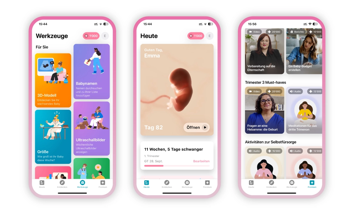 Verfolgen Sie die Entwicklung Ihres Babys Woche für Woche mit interaktiven 3D-Modellen und erfahren Sie, welche Übungen, Nahrungsmittel