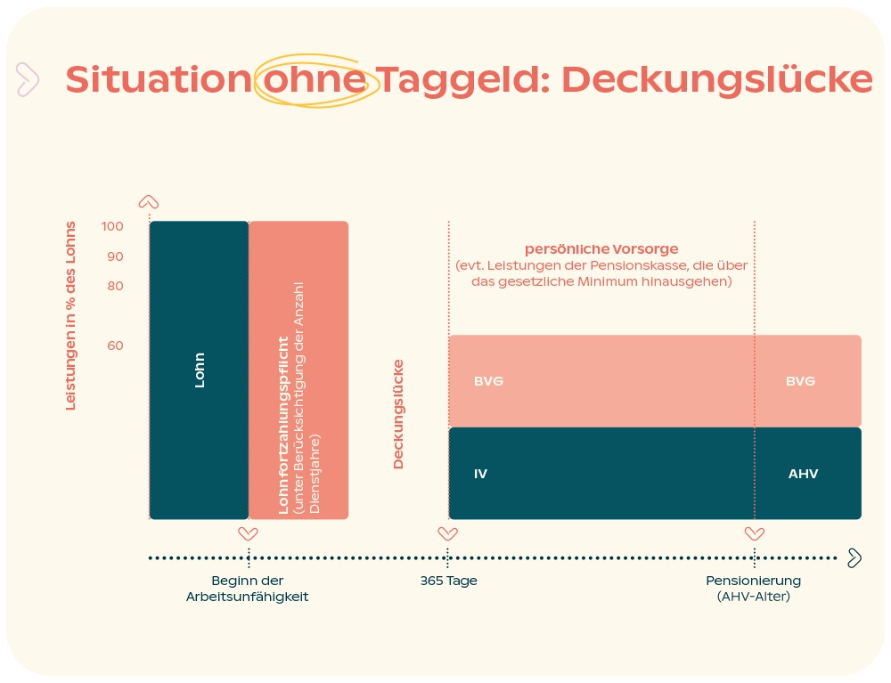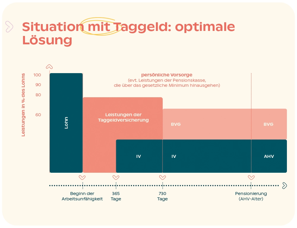 - Die Versicherung bezahlt Taggelder für Mitarbeitende, die wegen Krankheit oder Mutterschaft arbeitsunfähig sind.