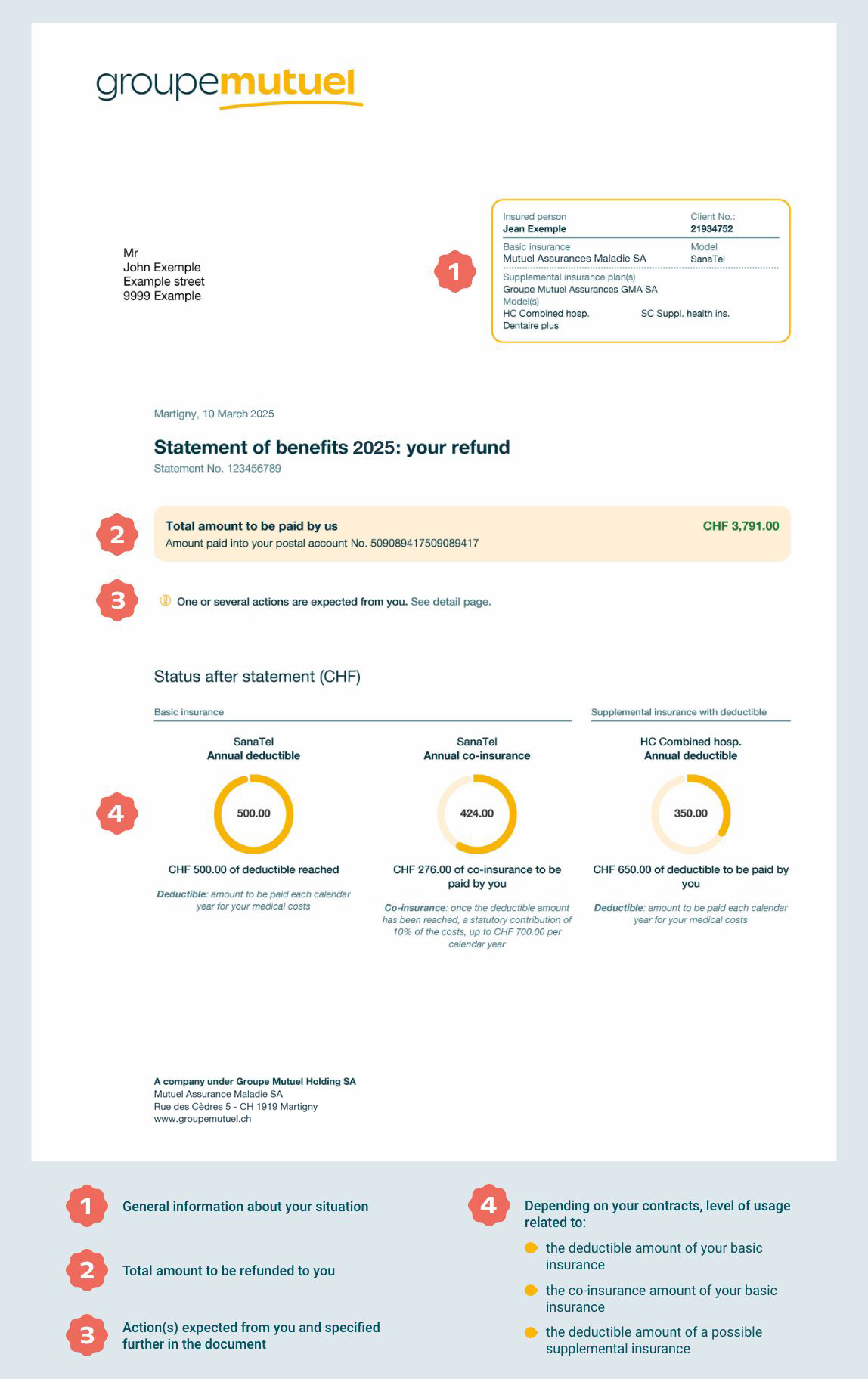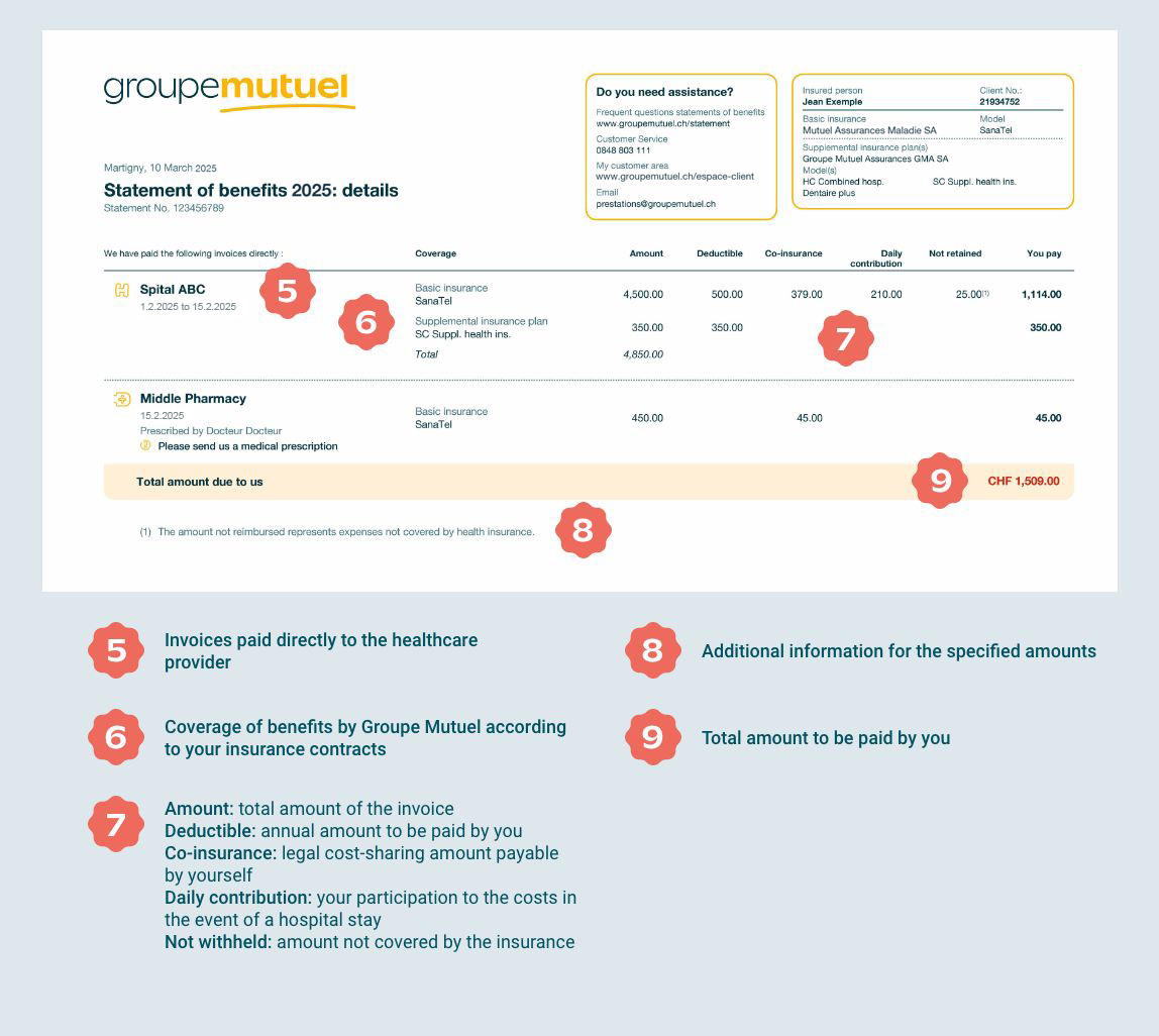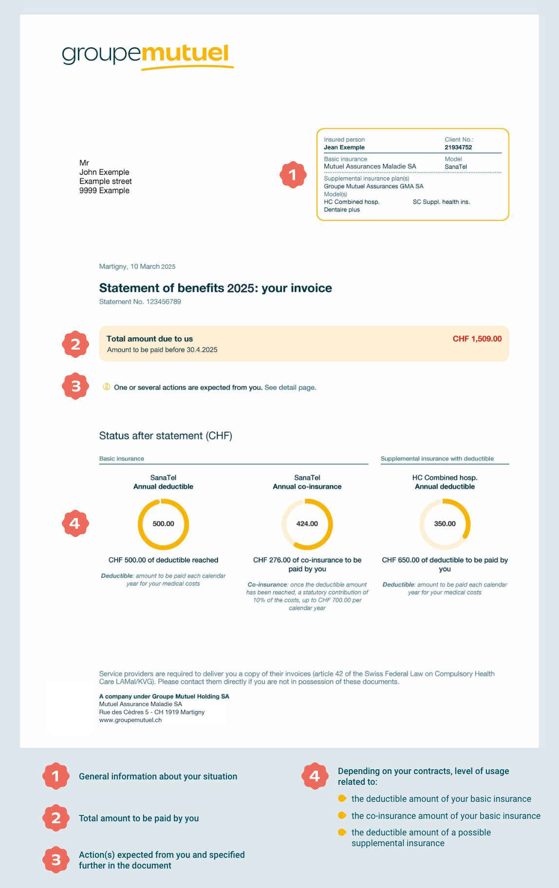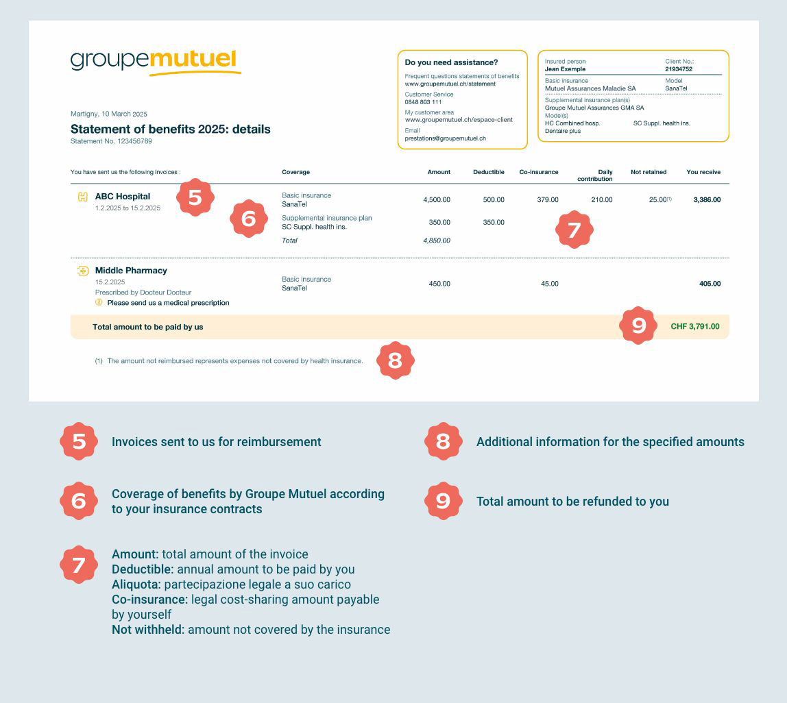 - either your insurer pays the invoices directly to your doctor, your pharmacy or the hospital, and then asks you to refund the cost-sharing amounts (deductible, co-insurance) by way of a statement of benefits;
